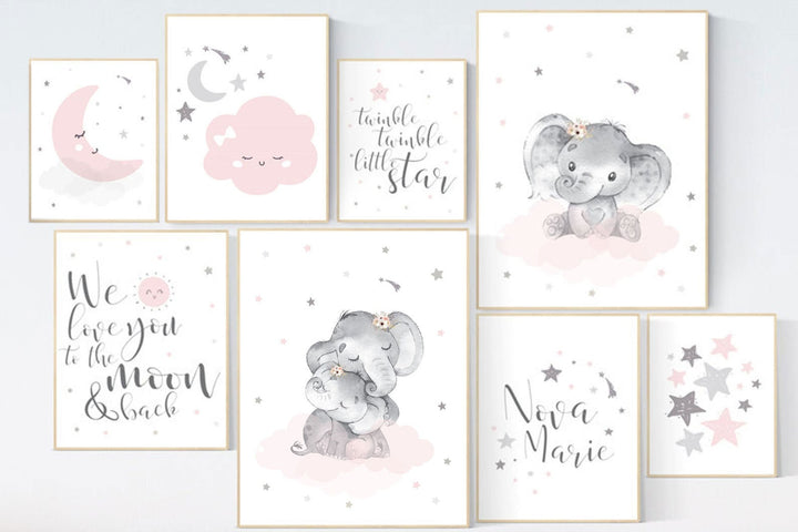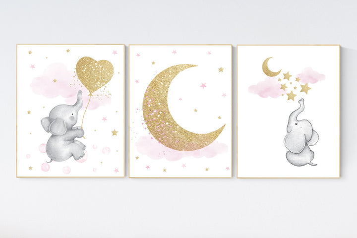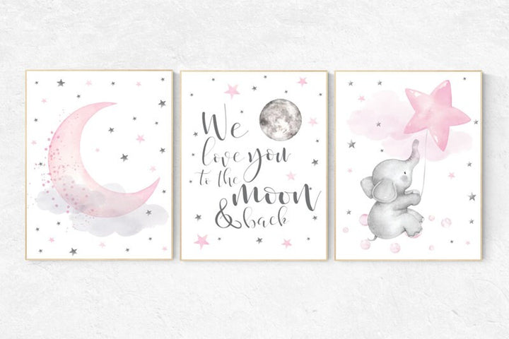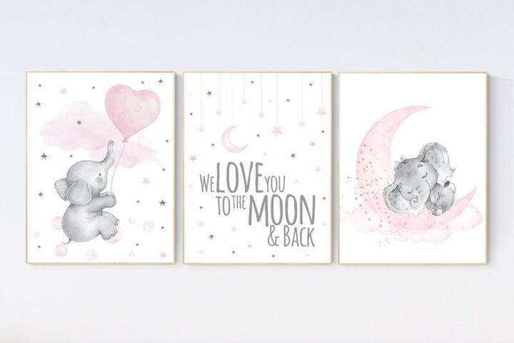 Nursery wall art girl pink and gray, elephant nursery decor, nursery decor girl pink, moon and stars, girl nursery wall art, elephant prints