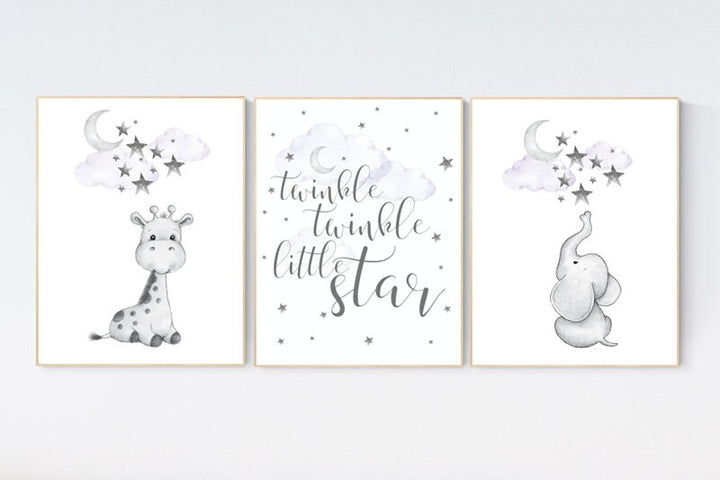 Nursery wall art girl giraffe, Nursery decor girl purple, lilac, nursery decor elephant, elephant giraffe, twinkle twinkle little star