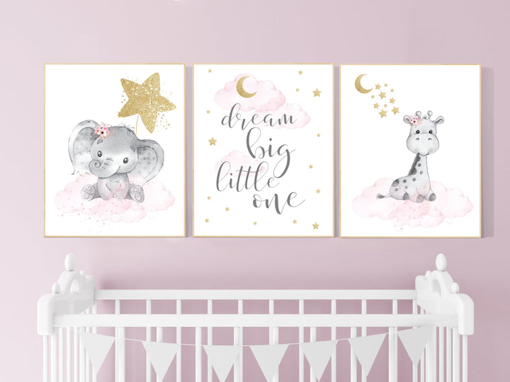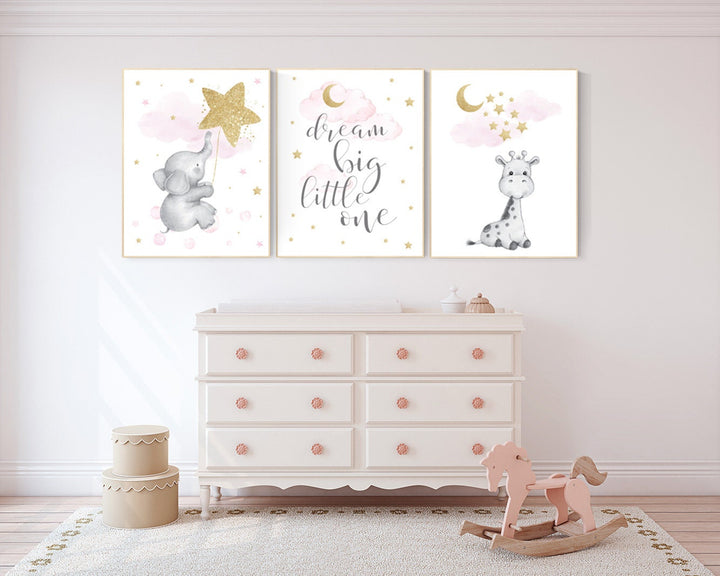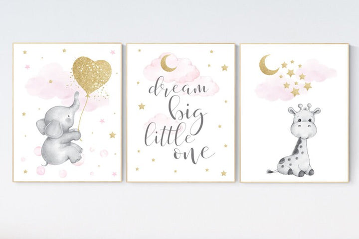 Nursery wall art girl, giraffe nursery, baby room decor girl gold and pink, dream big little one, cloud and stars, elephant nursery wall art