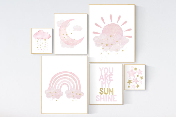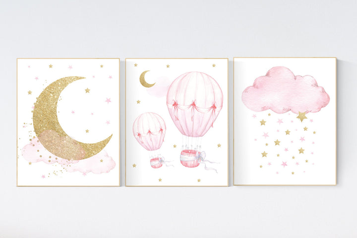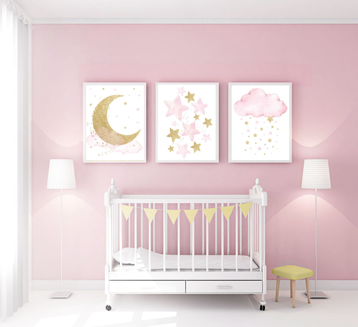 Nursery wall art girl, baby room decor girl gold and pink, moon and star, baby room decor, girl nursery wall art, star nursery, gold nursery