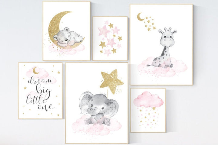 Nursery wall art girl, baby room decor girl gold and pink, giraffe nursery, elephant nursery wall art, dream big little one, cloud, stars