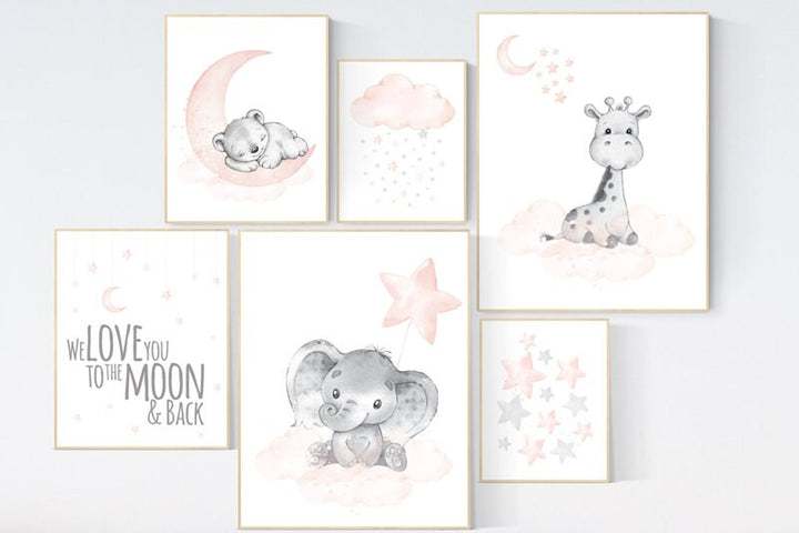 Nursery wall art girl, blush grey, elephant giraffe bear nursery, nursery wall art girl, we love you to the moon and back, blush pink