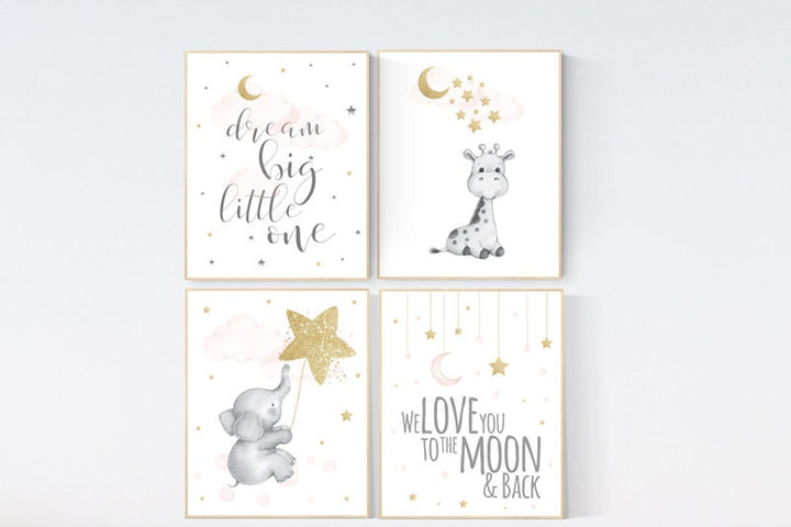 Nursery wall art girl, giraffe nursery, baby room decor girl gold and pink, dream big little one, moon and stars, elephant nursery