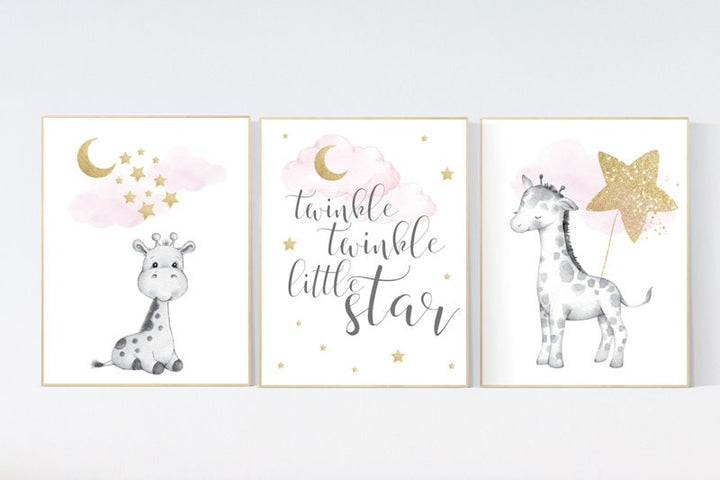 Nursery wall art girl, giraffe nursery, baby room decor girl gold and pink, twinkle twinkle little star, cloud and stars, girl nursery