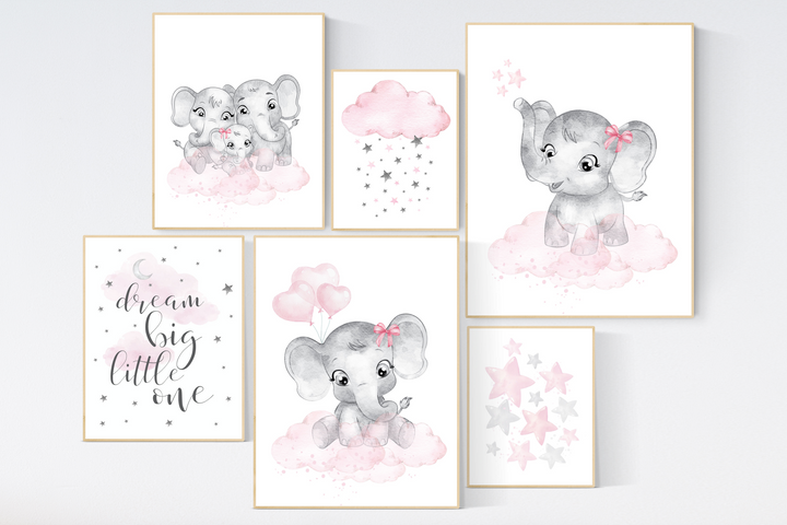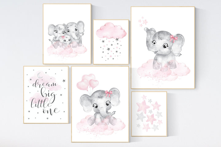 Nursery wall art girl, baby room decor girl pink gray, giraffe nursery, dream big little one, cloud and stars, elephant nursery wall art