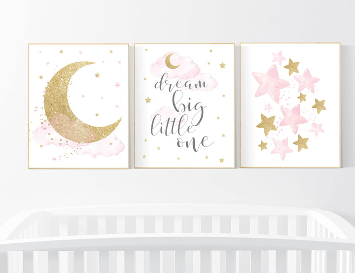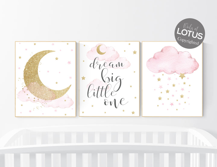 Nursery wall art girl pink and gold, baby room decor girl gold and pink, dream big little one, cloud and stars, baby room, moon and star