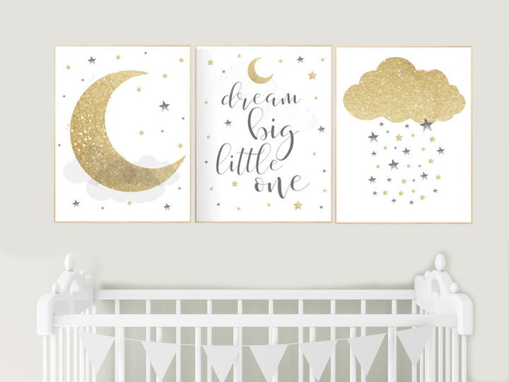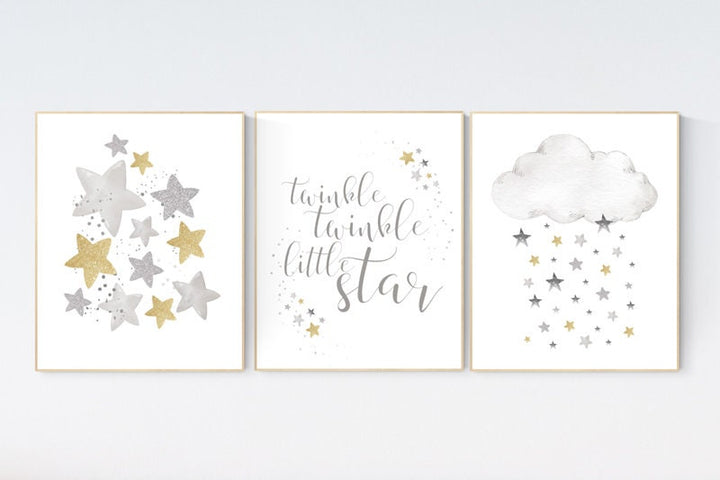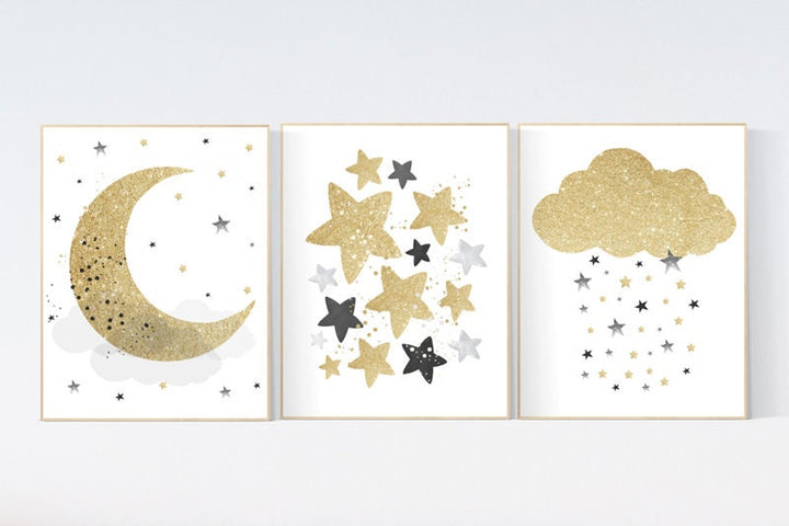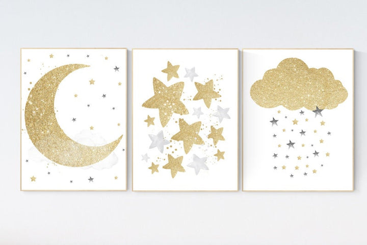 Nursery wall art gold, gold gray nursery, nursery decor neutral, moon and stars, baby room, gold silver nursery, twinkle twinkle little star