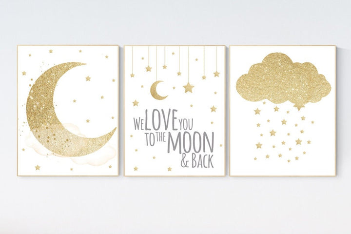 Nursery wall art gold, gold gray nursery, nursery decor neutral, moon and stars, baby room, gold silver nursery, moon and stars