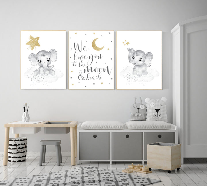 Nursery wall art gray, grey nursery, gender neutral, cloud and stars, we love you to the moon and back, elephant nursery set, neutral colors