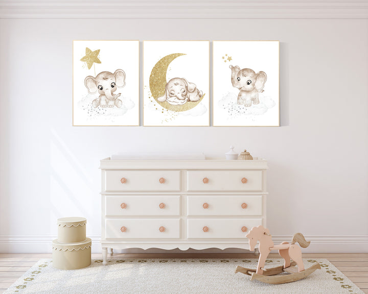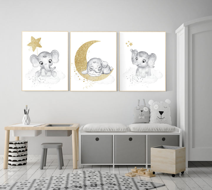 Nursery wall art grey, gray gold nursery, elephant nursery, nursery decor neutral, baby room decor gender neutral, moon and stars, grey gold
