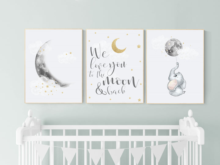 Nursery wall art grey, gray gold nursery, moon nursery, elephant, gender neutral nursery decor, baby room decor gender, moon and stars