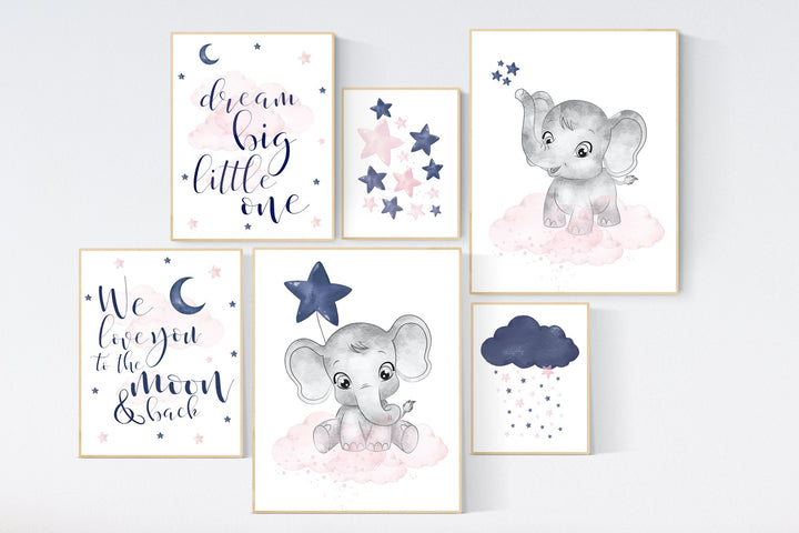 Nursery wall art girl, twin nursery, pink and navy, elephant nursery, dream big little one, girl nursery decor, nursery print set, elephant