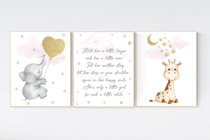 Nursery wall art girl, pink, purple and gold nursery, elephant nursery art, quote nursery, cloud and stars, baby room decor for girls