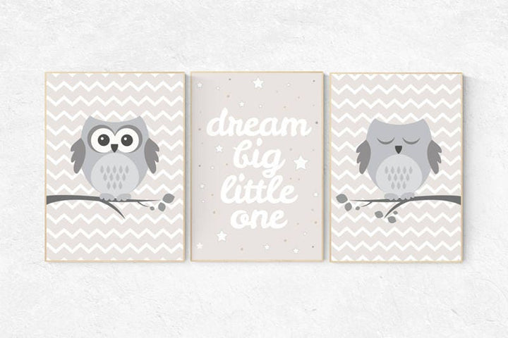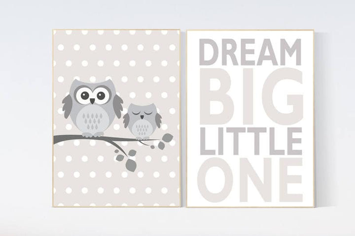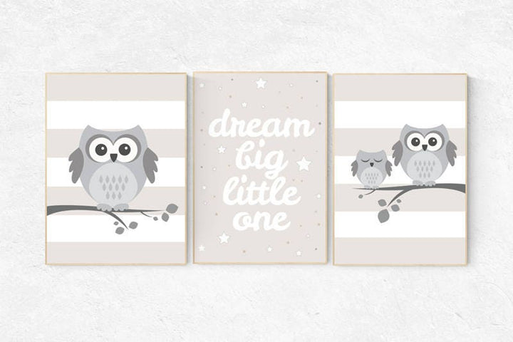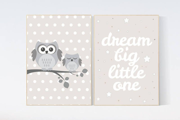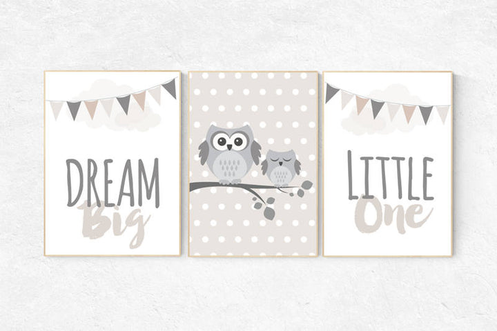 Owl nursery wall art, Dream Big Little One, gender neutral nursery, beige and cream, Nursery, Nursery Decor, Gray Beige gender neutral baby