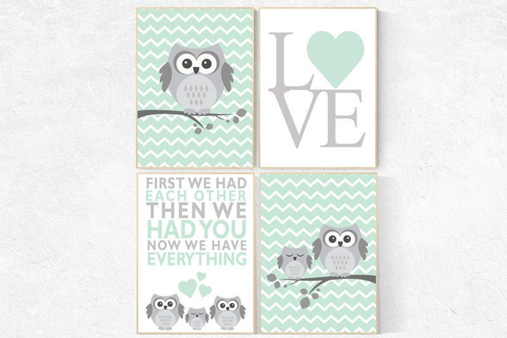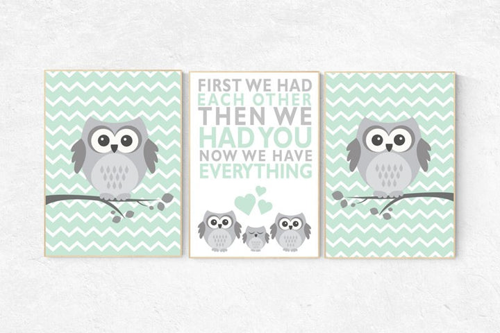 Owl nursery wall art, mint nursery decor, first we had each other then we had you, mint gray, owl room decor, owl nursery decor, kids room