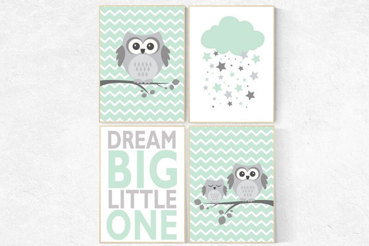 Owl nursery wall art, gender neutral nursery decor, mint nursery decor, dream big little one, mint gray, owl room decor, owl nursery decor