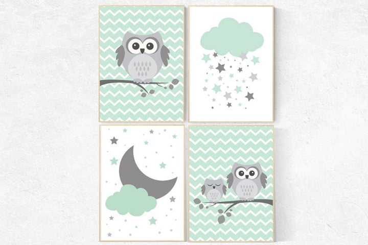 Owl nursery wall art, gender neutral nursery decor, mint nursery decor, mint gray, owl room decor, owl nursery decor, light green nursery