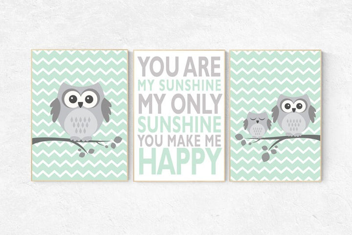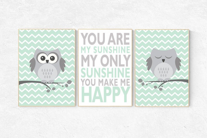 Owl nursery wall art, mint nursery decor, you are my sunshine wall art, mint gray, owl room decor, owl nursery, gender neutral nursery decor