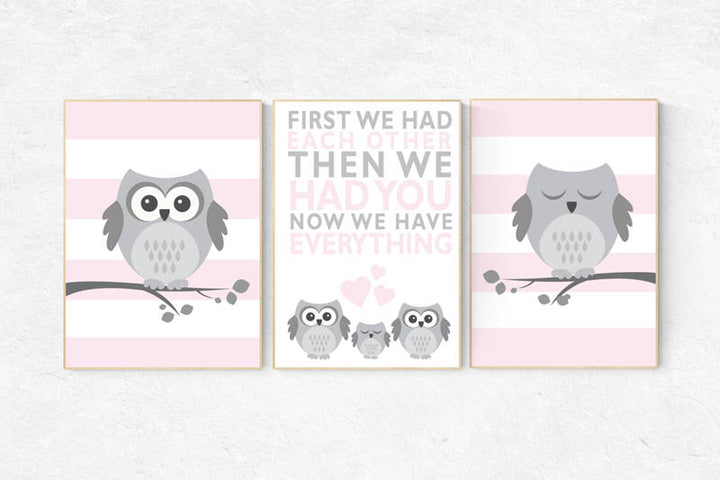 Owl nursery wall art, pink nursery decor, first we had each other then we had you, pink gray, owl room decor, owl nursery decor girls, baby