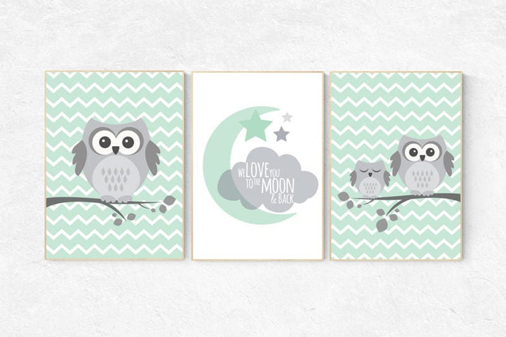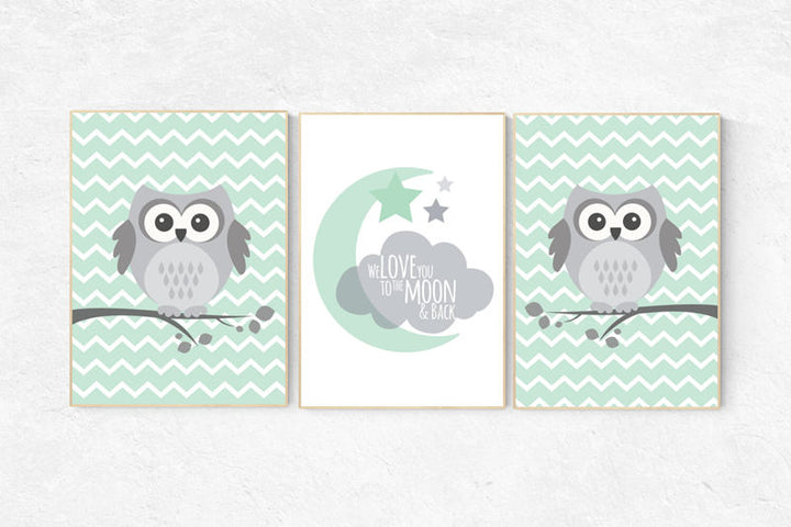 Owl Nursery Wall Art, gender neutral nursery decor, we love you to the moon, baby room decor, mint gray, owl room decor, owl nursery decor