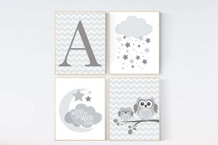 Owl nursery decor, gender neutral nursery decor, gray nursery decor, we love you to the moon and back, grey nursery, owl room decor