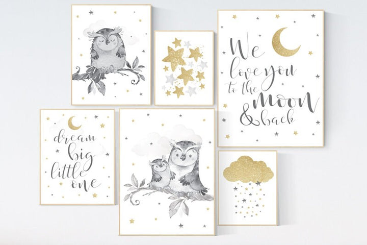 Owl nursery print set, gender neutral, gold, gray nursery, grey nursery, we love you to the moon and back, gold nursery, neutral, owls print