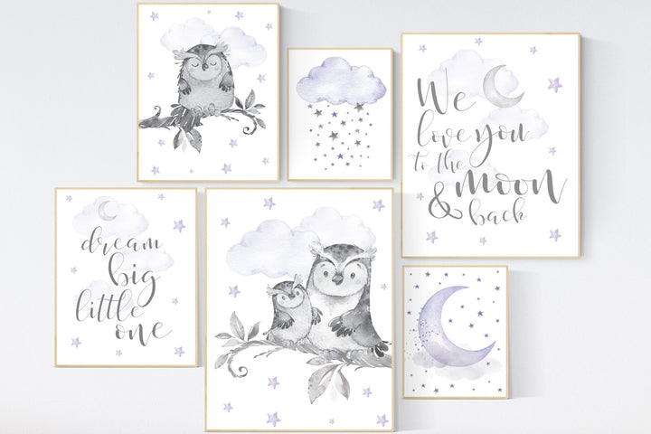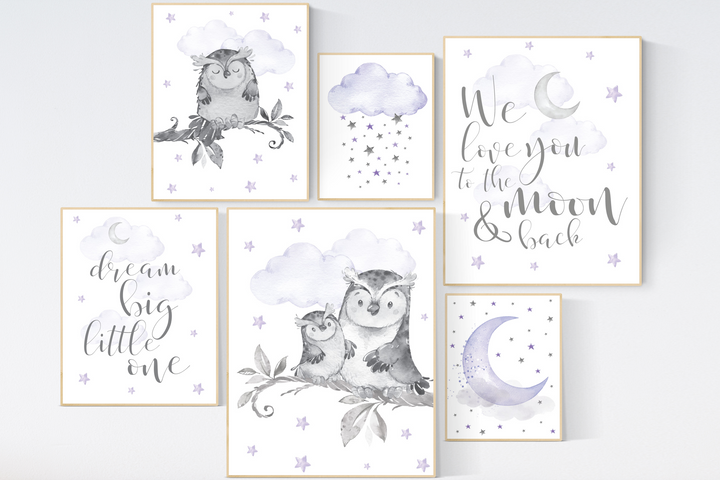 Owl Nursery Decor girl, purple nursery, owl print nursery, Baby girl room, nursery prints owl, lilac