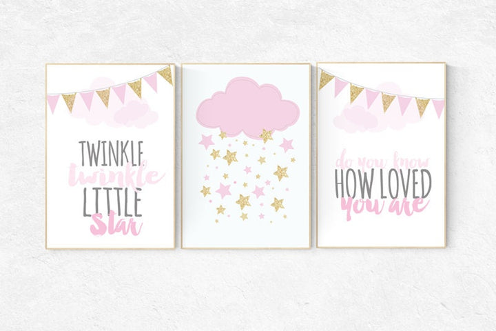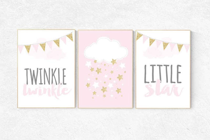 Pink gold nursery, girls room decor, cloud nursery wall art, Twinkle twinkle little star, pink and gold baby shower, baby girl nursery art