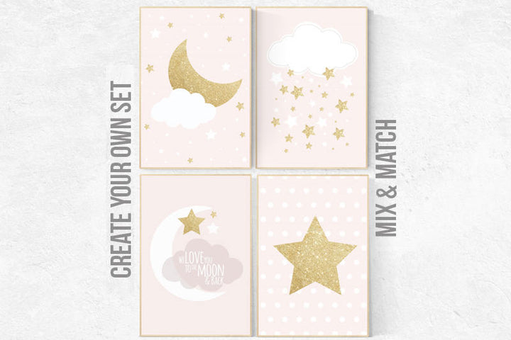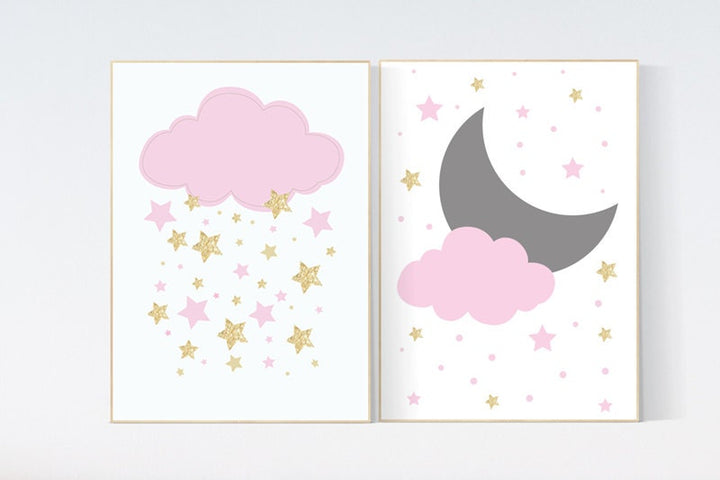 Pink gold nursery decor, nursery wall art girl, pink and gold nursery art, cloud and stars, baby room prints, gold nursery, baby room art