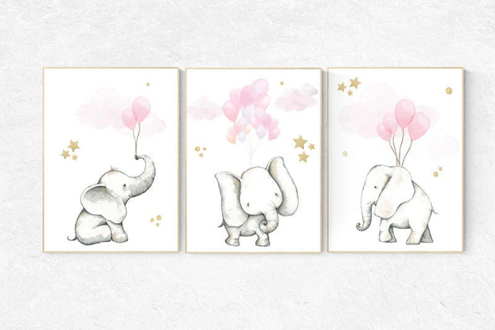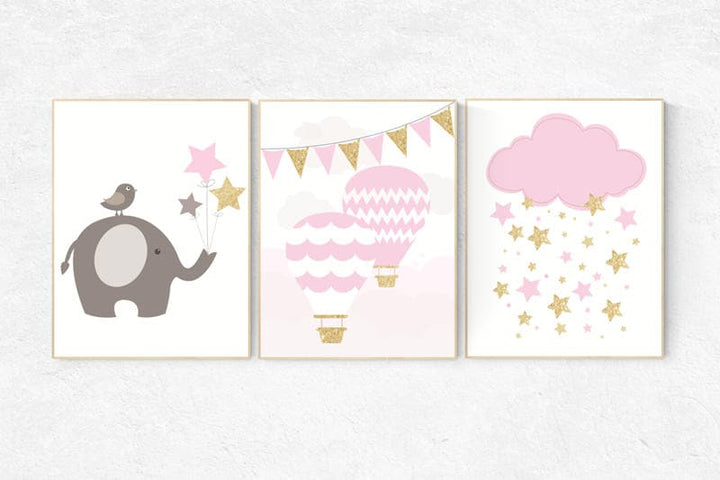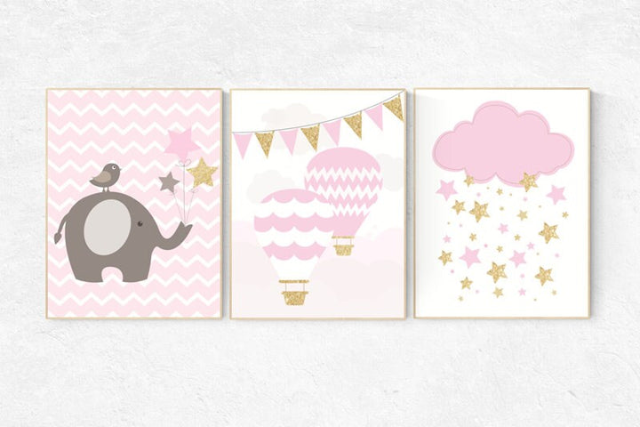Pink gold nursery, elephant nursery, pink and gold baby shower, hot air balloon nursery, girls nursery room, nursery wall art, set of 3