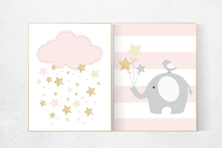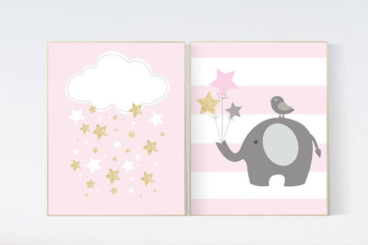 Pink gold nursery decor, Elephant nursery, cloud nursery, baby girl nursery wall art, baby room decor, nursery decor girls, baby room prints