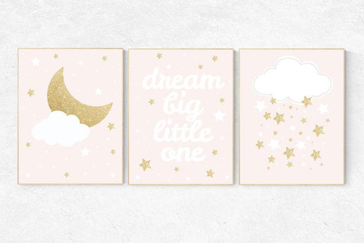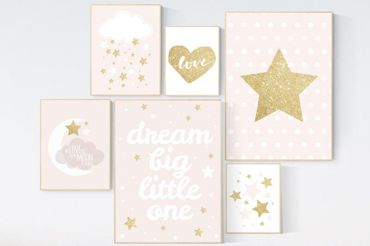 Pink gold nursery art, dream big little one, twinkle twinkle little star, nursery decor, pale pink, moon nursery, baby girl nursery wall art
