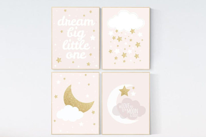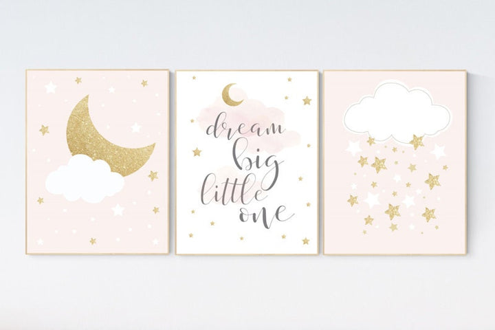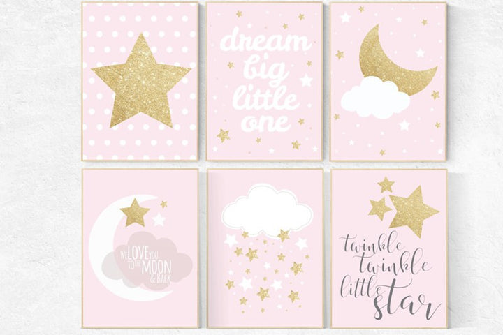 Pink gold nursery art, dream big little one, twinkle twinkle little star, nursery decor, pink and gold, moon nursery, baby girl wall art