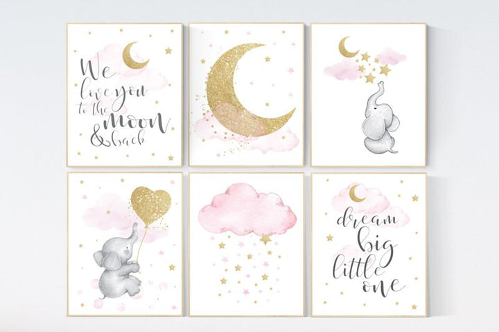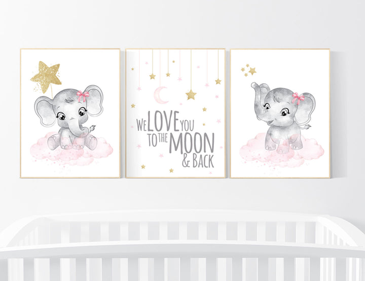 Pink gold nursery art, elephant nursery decor girl, we love you to the moon and back, elephant nursery print, pink and gold, girls room art
