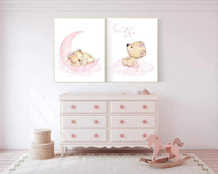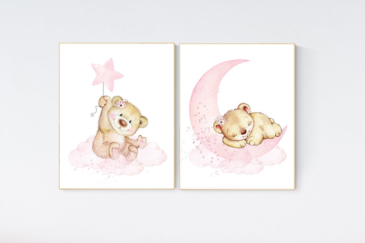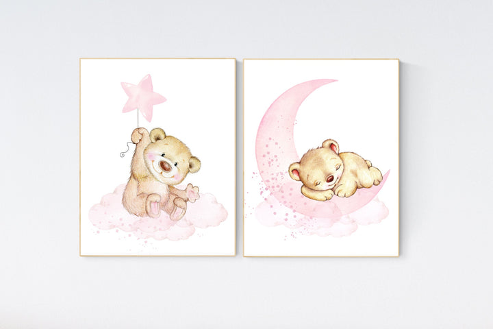 Pink girl room print, Nursery wall art bear, girl nursery decor animals, baby girl room, teddy bear, nursery art, girl room decor