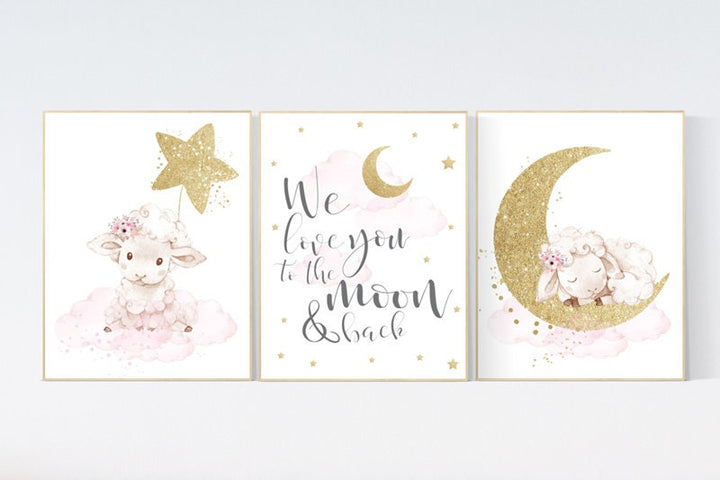 Pink gold nursery decor, Sheep nursery decor, nursery decor lambs, we love you to the moon and back, nursery wall art sheep, moon cloud star