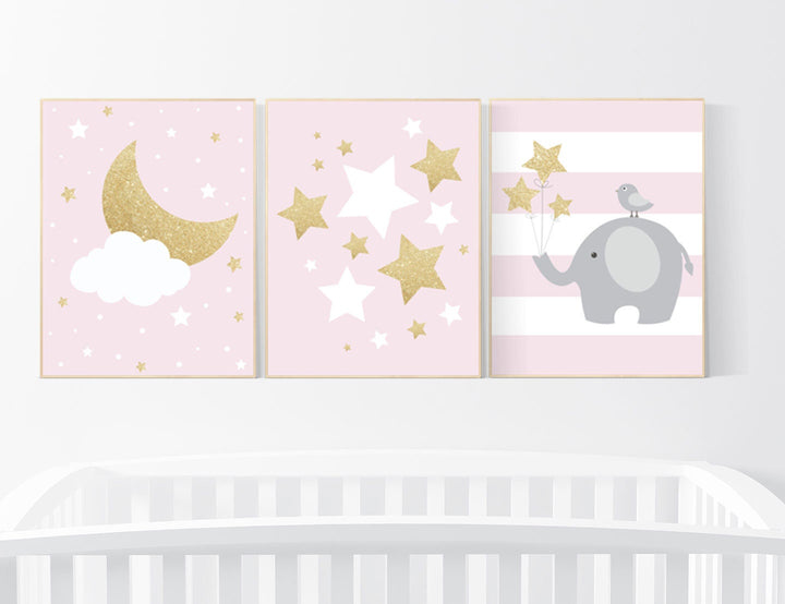 Pink gold nursery, girl room wall art, baby nursery wall art, moon and stars, pink and gold, Nursery decor girl, nursery decor elephant