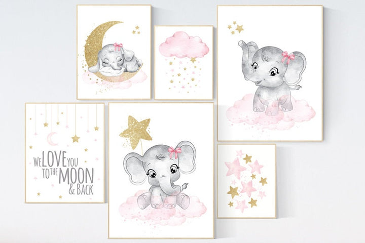 Pink gold nursery decor, Moon cloud star nursery, elephant, nursery set of 6, nursery ideas for girls, girl nursery ideas, elephant nursery