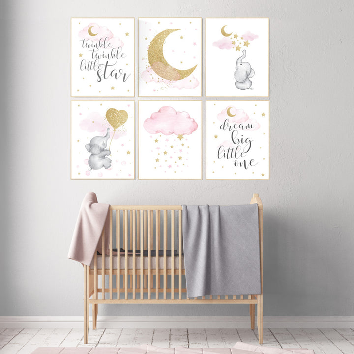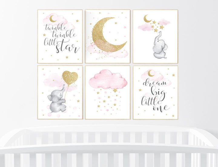 Pink gold nursery art, elephant nursery, dream big little one, twinkle twinkle little star, nursery decor, pink and gold, baby girl wall art