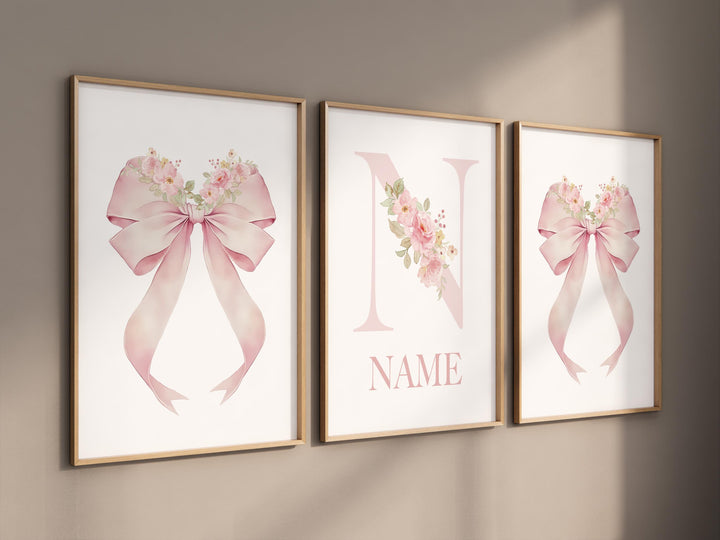 Pink Floral Nursery Wall Art Set of 3 - Bow Name Print for Baby Girl - Custom Initial Poster - Elegant Baby Girl Room Decor, girls room