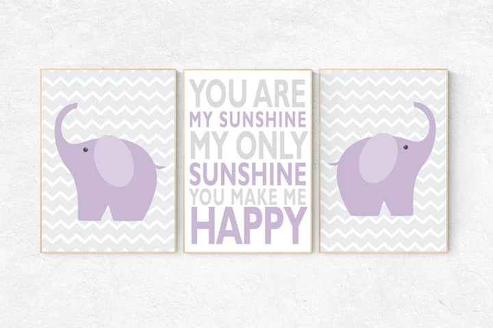 Purple grey nursery decor, You are my sunshine my only sunshine, Baby girl nursery decor, lilac nursery decor, elephant nursery, lavender