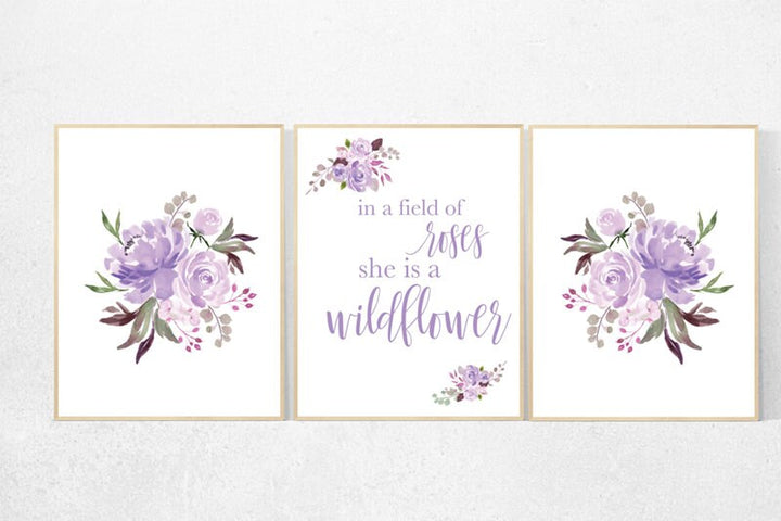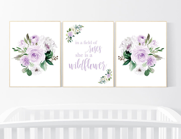 Purple flower nursery decor, Nursery decor girl purple, in a field of roses she is a wildflower, lavender nursery, lilac nursery, girls room