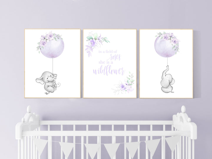 Purple flower nursery decor, Nursery decor girl purple, in a field of wildflowers, lavender, lilac, elephant, girls room, balloon nursery