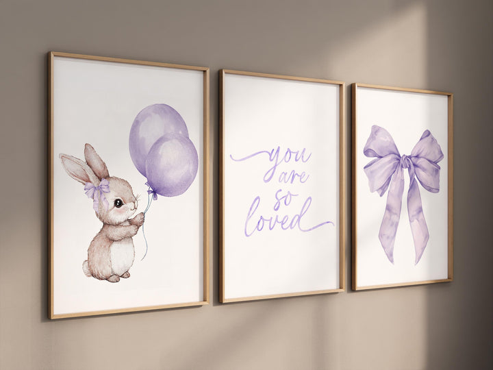 Purple bunny nursery art, watercolor rabbit print, baby girl room decor, pastel bow wall print, you are so loved, baby room print, nursery