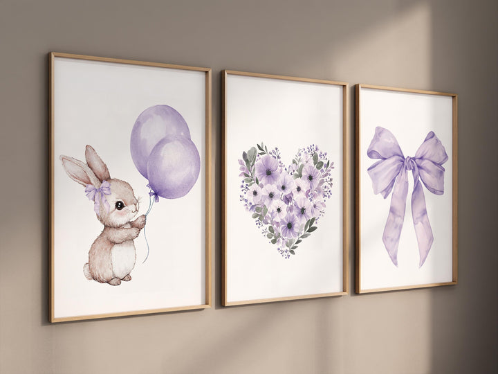 purple bunny nursery art, watercolor rabbit print, floral heart wall decor, pastel bow baby room print, baby girl nursery wall art