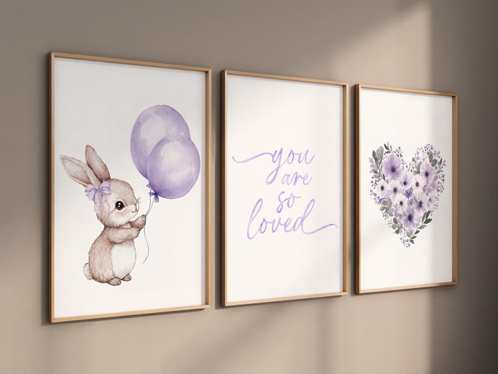 Purple bunny nursery art, watercolor rabbit print, baby girl nursery decor, floral heart wall art, you are so loved baby room print, nursery