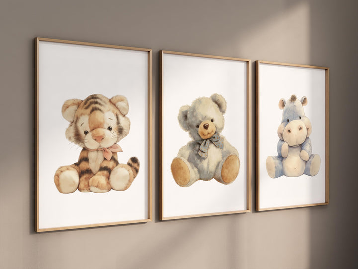 Plush Animal Nursery Wall Art – Tiger, Teddy Bear & Hippo Prints, Cute Stuffed Animal Decor, Soft Pastel Baby Room Watercolor Art