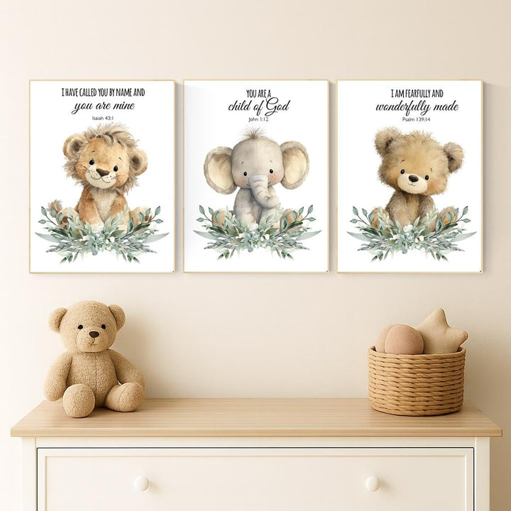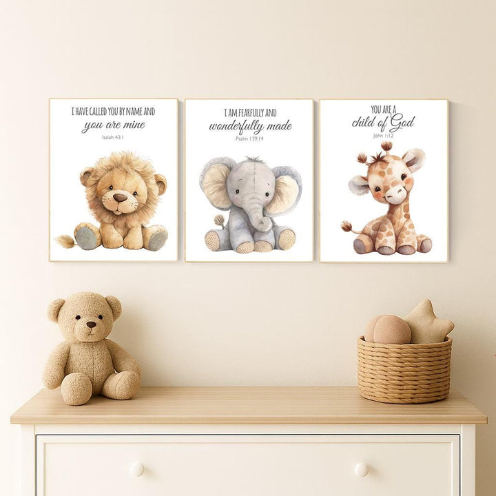 Plush Safari Animal Bible Verse Wall Art – Elephant Giraffe Lion Nursery Prints, Scripture Art, Christian Baby Room Decor Set
