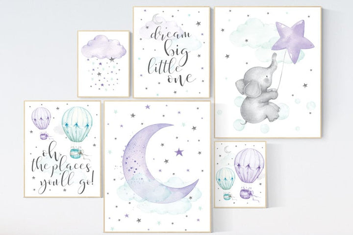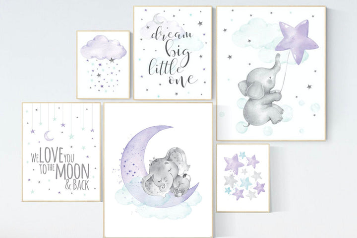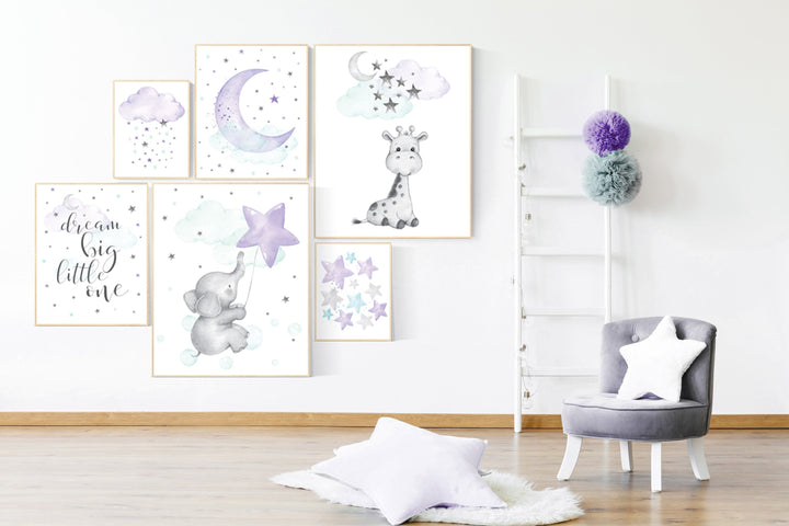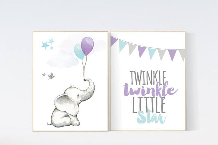 Purple mint nursery decor, twinkle twinkle little star, nursery decor elephant, animal prints, elephant baby room, lavender mint, lilac