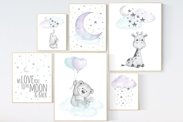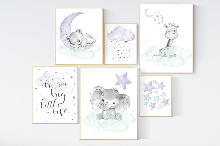 Purple mint nursery wall art, Nursery decor girl purple, Bear Elephant, giraffe, nurser decor girl, lilac nursery print, lavender, lilac